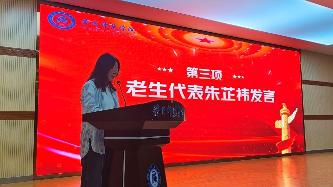 院员工会主席朱芷祎代表老生发言,她鼓励新生遇到困难时要积极寻求帮助,老师、学长学姐和同学都会是他们的坚强后盾,同时祝愿新生在大学里收获满满、幸福成长。新生代表何希瑞发言中满怀对老员工活的憧憬,他承诺:作为新时代的政法学子,既要传承好黄师精神,更要扛起属于自己的责任;面对即将开启的老员工活,以青春为笔,以奋斗为墨,在黄师的校园里,书写属于我们的精彩篇章!