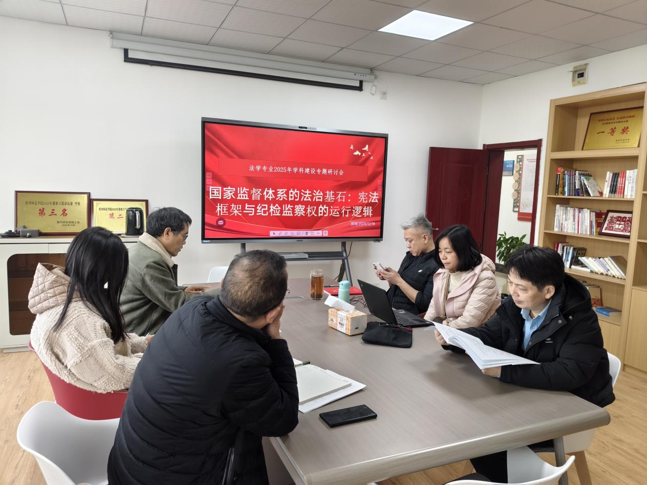 2025年12月18日,法学专业“国家监督体系的法治基石:宪法框架与纪检监察权的运行逻辑”专题研讨会在职工小家会议室顺利召开,会议由教研室主任韩清友主持,王贵东经理、张华副经理及全体法学专业教师齐聚一堂、参与研讨。
